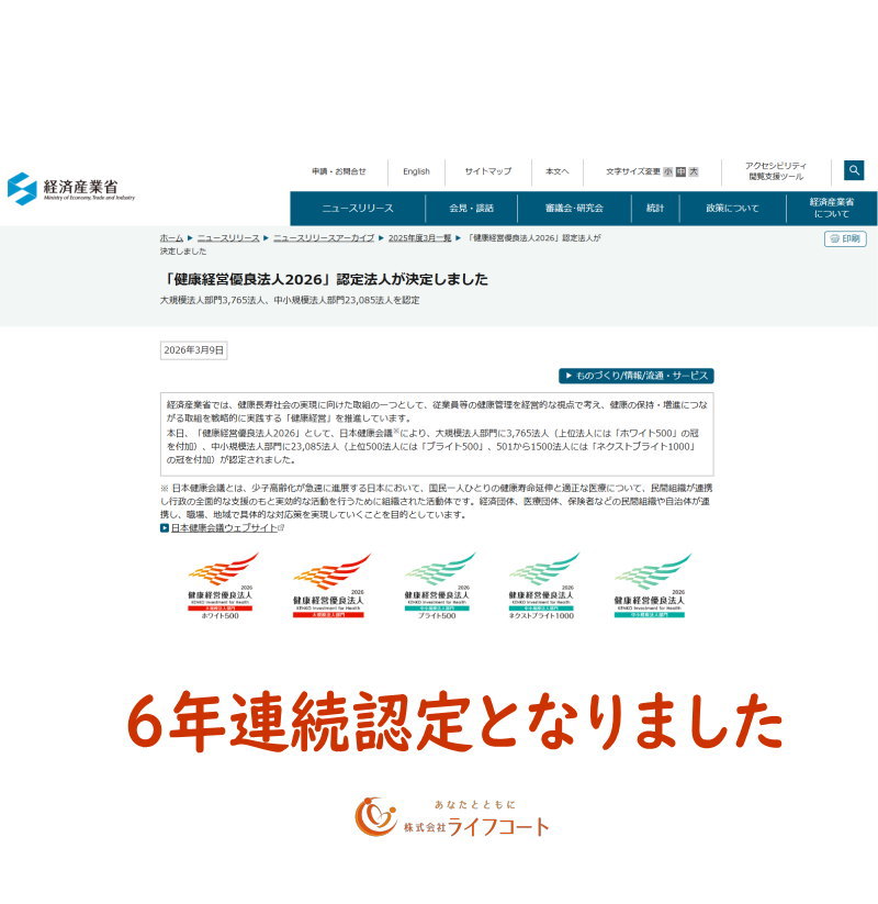 2026年3月10日 / 最終更新日 : 2026年3月10日 森田 真人 あんしん保険ニュース 健康経営優良法人2026 認定法人の発表 本日、「健康経営優良法人2026」認定法人の発表でした。 「健康経営優良法人2026」認定法人が決定しました (METI/経済産業省) これからも次年度に向けて、ライフコートの「健康経営」の観点での取り組みを進めてまいります。 「健康経営優良法人」認定に向けて、気になる点などございましたら、弊社の取り組みなど共有させていただきますので、お気軽にお問い合わせください。 ライフコートの最新情報をお届けします @AgentMasato 個人/事業者/法人さま向けの保険のご相談を承っております保険のご相談をお待ちしております資料のご請求はこちらFacebookXBlueskyHatenaCopy コメントを残す コメントをキャンセルメールアドレスが公開されることはありません。 ※ が付いている欄は必須項目ですコメント ※ 名前 ※ メール ※ サイト