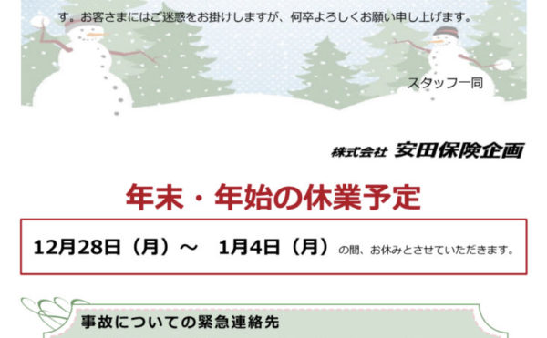 2020年12月25日保険にまつわる情報森田 真人 2020年 年末のご挨拶当社、本日、25日(金)で仕事納めとさせていただきました。 また今年も多くのお客さまに支えられ、ここまで来ることができました。創業55年の年からまたひとつお客さまとともに歩むことができ、誠に感謝申し上げます。 また来年も […]