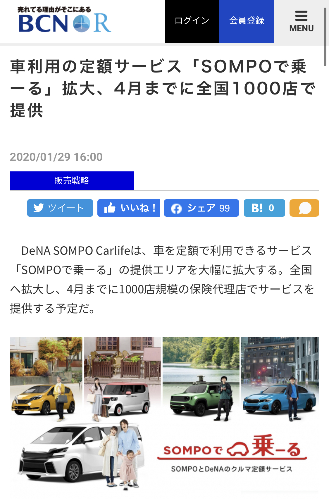 2020年1月31日保険にまつわる情報森田 真人 SOMPOで乗ーる車を所有しない形で、リースにも似たような定額サービス「SOMPOで乗ーる」がこれから我々、代理店窓口でお申し込みができるようになります。 https://www.bcnretail.com/market/detail/2 […]