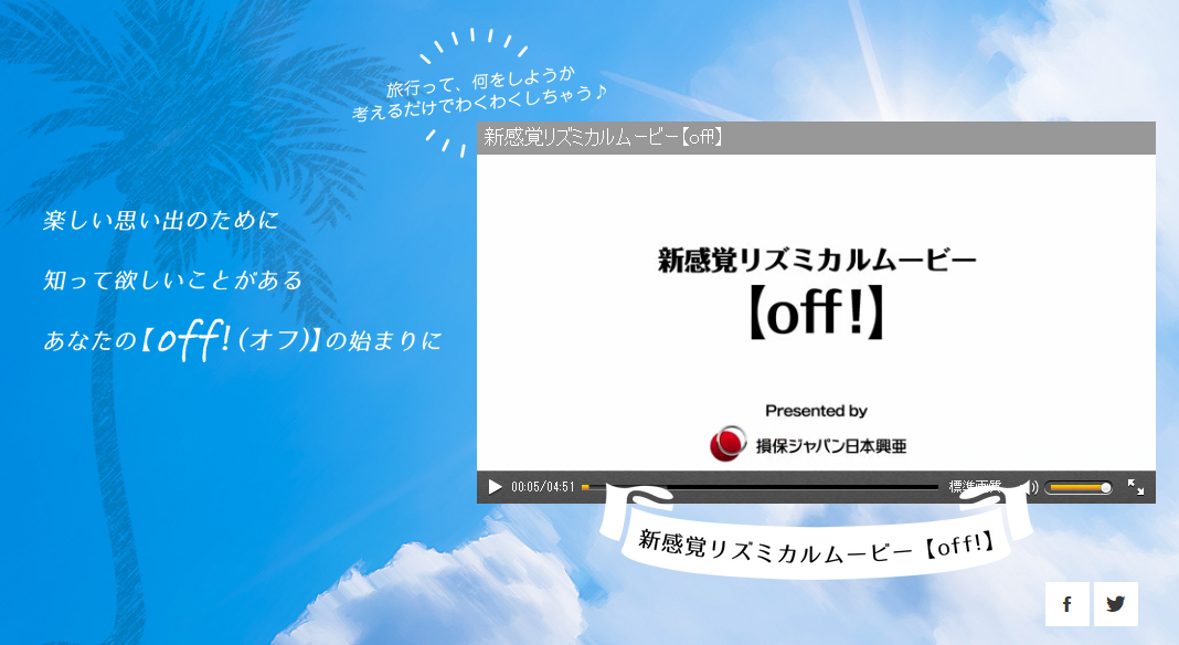 2017年6月19日保険にまつわる情報森田 真人 ムービー配信【ムービー配信】 損害保険ジャパン日本興亜株式会社の新・海外旅行保険【off!(オフ)】の新感覚リズミカルムービーが今日(6月19日)から配信開始となりました。 海外旅行中に起きるさまざまなト […]